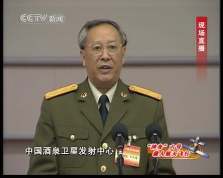 陳炳德:尊敬的胡總書記、溫總理,各位領導、各位來賓,同志們,根據航天城的測量結果,我現在鄭重宣布,神舟六號載人飛船發(fā)射取得圓滿成功。